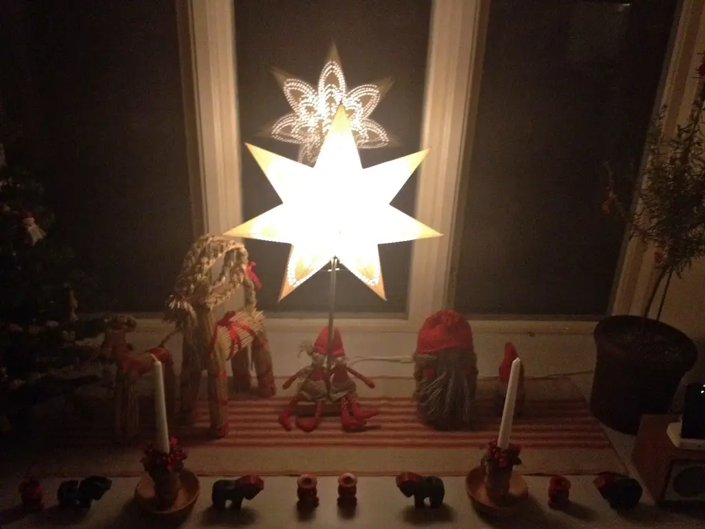 And this is the decorated window! Lotti and Totti were joined by two goats made of straw and two woollen elves/tomtar. I got the two ”tomtar” from my childhood home. I think Lotti and Totti liked the company anyway!