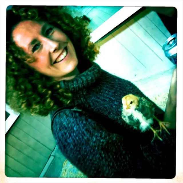 This woman is actually walking around with a living chicken on her arm! The mother hen had been killed by a fox, and since the woman began caring for this chicken, it refused to leave her. So she carries him/her with her all the time.