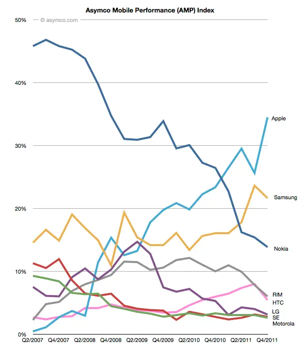 Check this diagram that I found at Asymco’s blog. It shows how sales for smartphones has developed.
