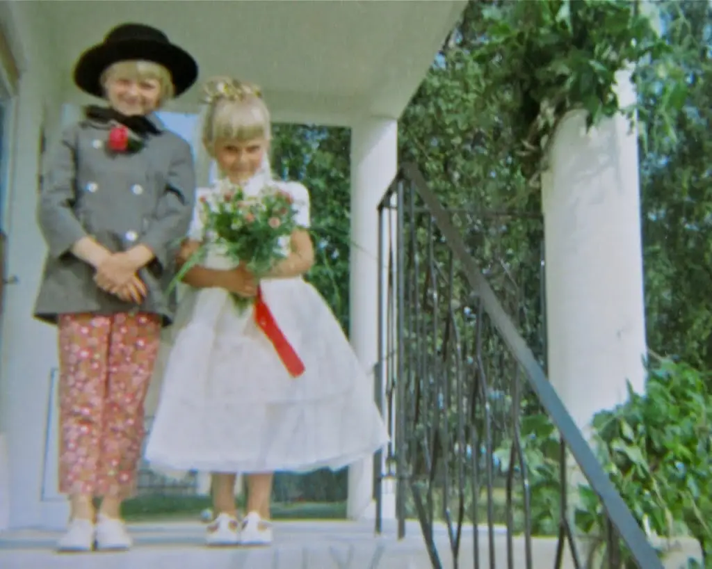 Jag kom på en sak till Gunnel och jag gjorde för att tjäna pengar. Vi klädde ut oss till brudpar och så gick vi till Vittinge Vantar (ett ställe hos Norrgårds-Edit där bl.a. min mamma sålde hemslöjd och annat) och väckte så stor förtjusning bland folk som var där att de började betala oss som tack för att de fotograferade oss. Uppmuntrade av detta så klädde vi ut oss även nästa dag – fast då utan hjälp av min syster som bl.a. gjort en brudkrona genom att arrangera mitt långa flätade hår. Jag har en känsla av att vi framstod som girigare dag 2 plus att vi nog inte heller var lika tjusiga då. Vi lade ner affärsidén.