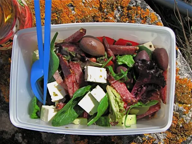 2) Och där intar man den medhavda salladen med salami och fetaost som därmed BLIR en gotländsk gourmetmåltid!