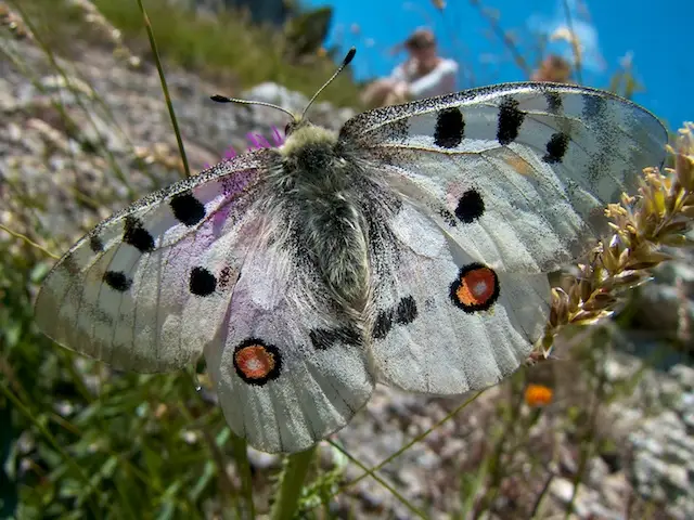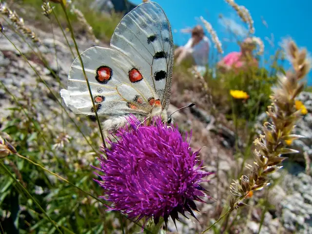 Jag fick syn på en Apollofjäril och kastade mig upp för att hinna fotografera. Men det vet ni väl hur det är med fjärilar, så snart man närmar sig med kameran flyger de sin väg… eller?