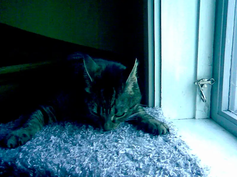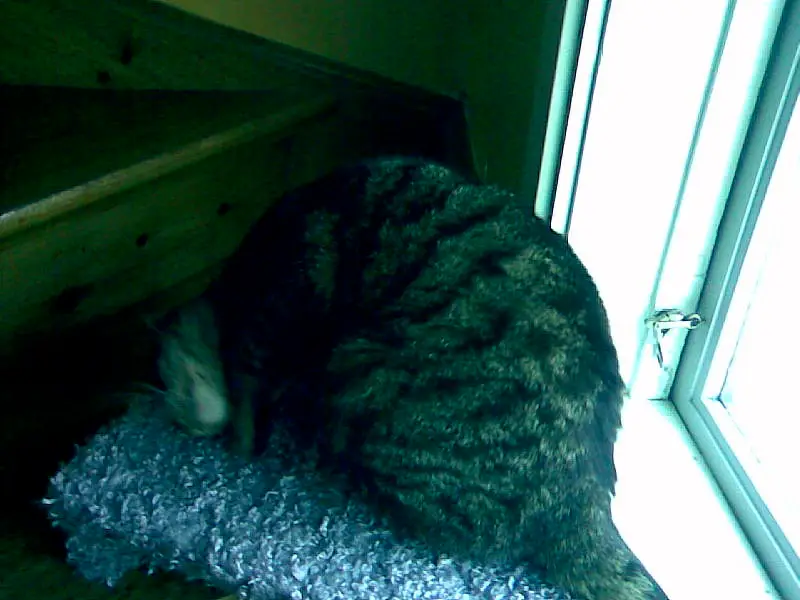 Så där håller han på och försöker tuta i oss att han inte gillar katter. Igår fick han plötsligt ett ryck och snickrade en liten plattform klädd med fuskpäls. Han placerade den i trappan vid fönstret ”så att Silver ska slippa ligga i luften när han vill titta ut”.