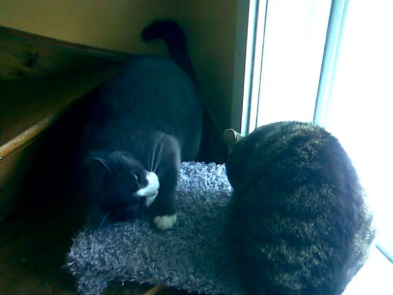 Så här såg det ut när katterna spanade in nyskapelsen, som jag preparerat med en smula kattmynta. Först var Silver på plats och drog in pälsen i näsborrarna. Sen kom Doris.