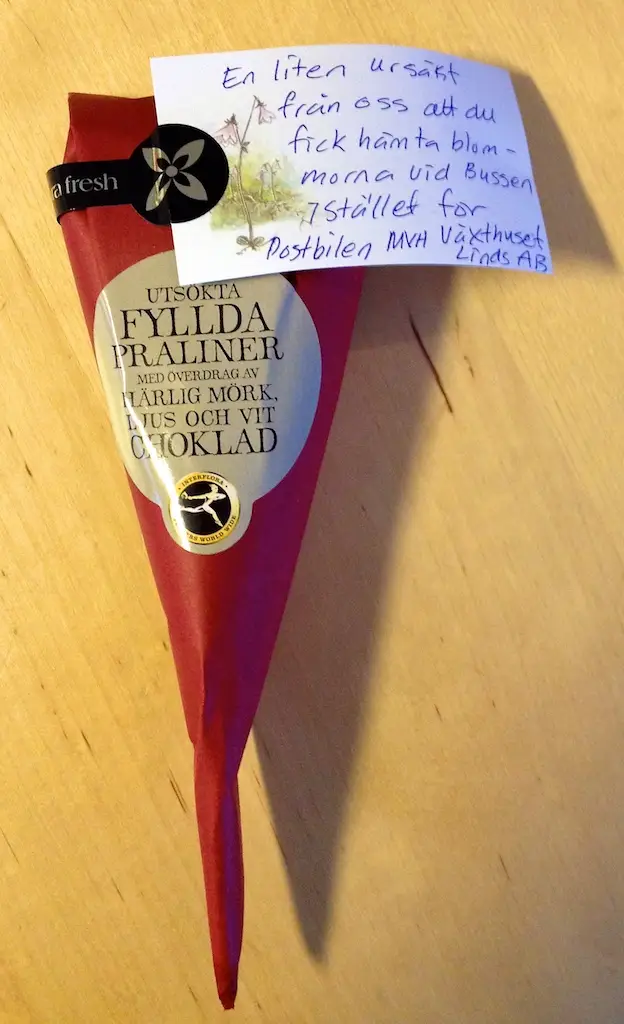 Sen fanns det något mer bland rosorna. En strut med praliner med en ursäkt från Linds. Tja, vi var inte direkt sura innan och med lite praliner på det så är det väl nästan helt omöjligt att få ner mungiporna. Snyggt jobbat Linds!