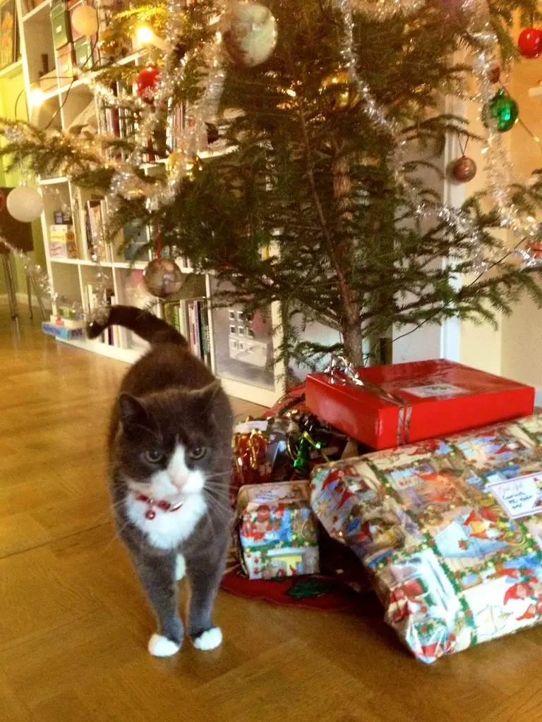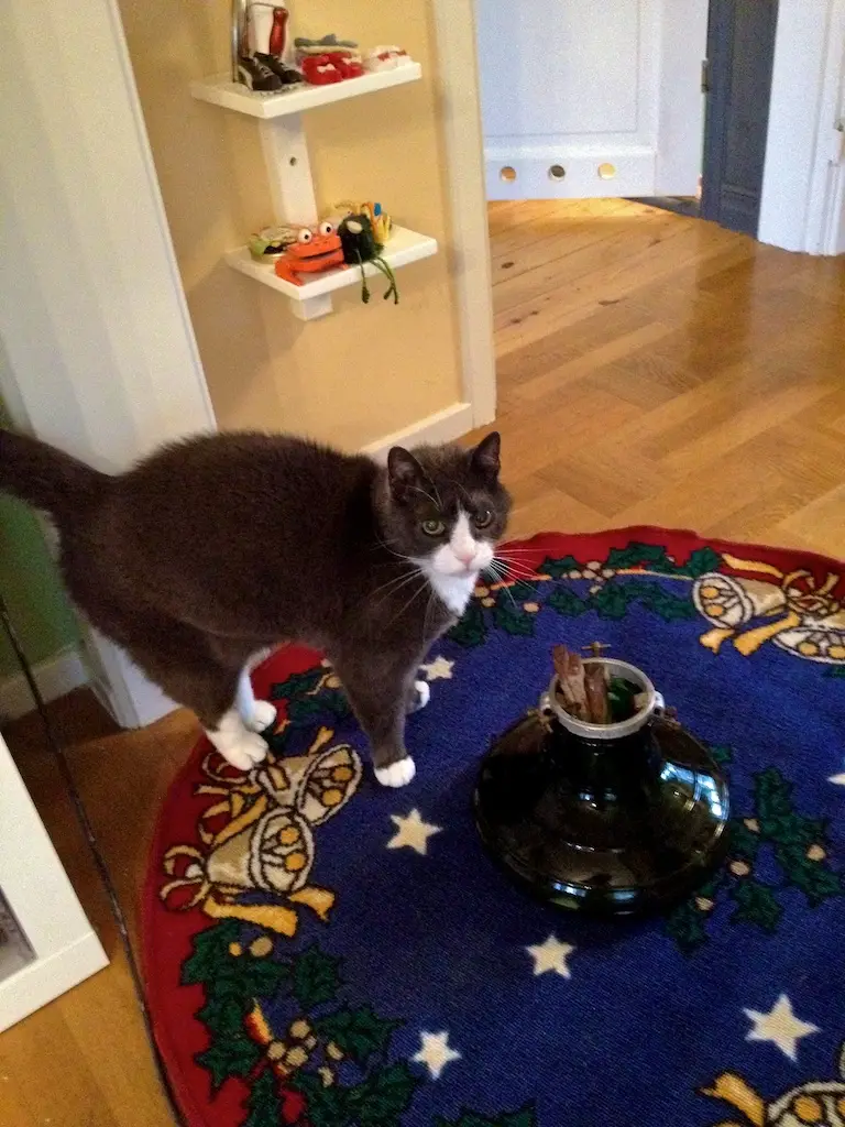 Silver tycker att bästa påhittet med julen är att vi är så snälla och tar in en gran till honom. Fast, här är han lite otålig eftersom det dröjer så innan själva granen kommer på plats…