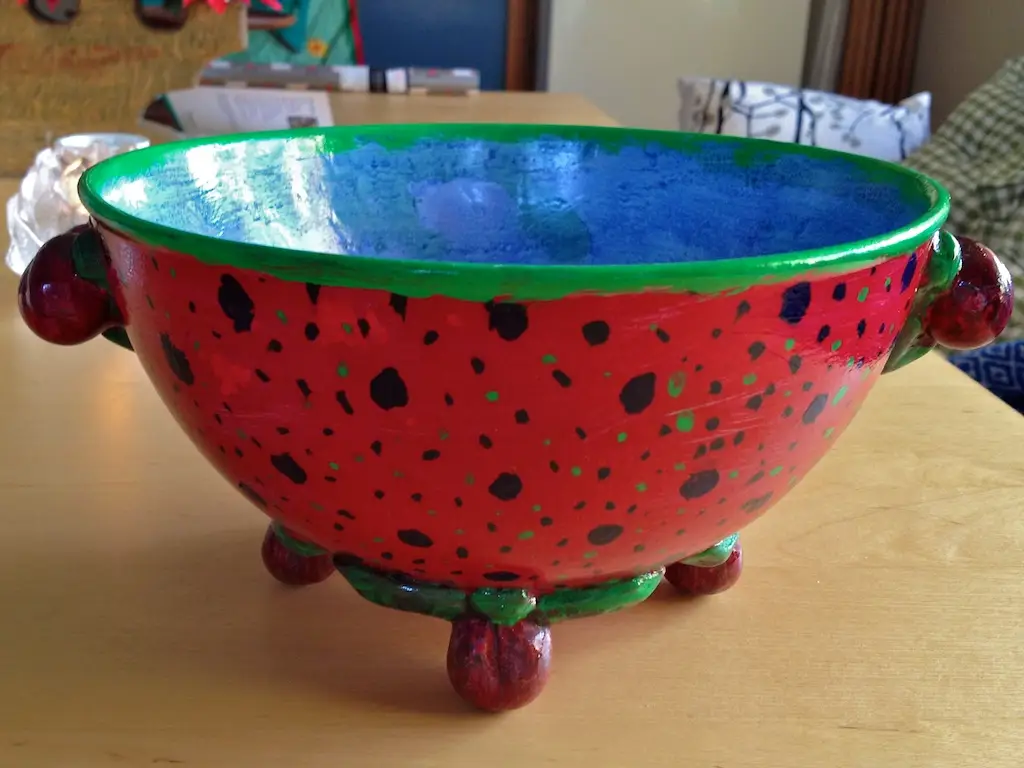Det här är inte direkt någon julsak, men samtidigt med julstädningen fick jag för mig att måla den här skålen och då fick det bli med de färger jag hade till hands. Skålen var ursprungligen vacker grön med ”guldfrost” men efter att jag var korkad nog att stoppa in den i diskmaskinen så flagade nästan all färg av… Sen dess har den stått och sett ful ut, men NU blev det dags att måla den med acrylfärg med urvalet ”de färger som inte torkat i sina tuber”.