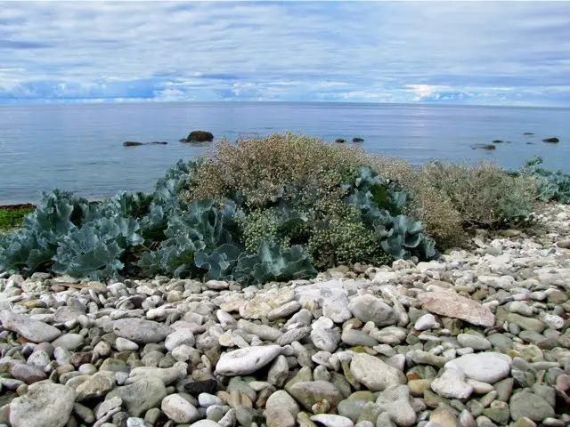 Här växer flera bestånd av strandkål. De är till skillnad från andra strandväxter lite blå i kulören, blågröna. Plus att de märkligt nog lyckas växa i rent grus?