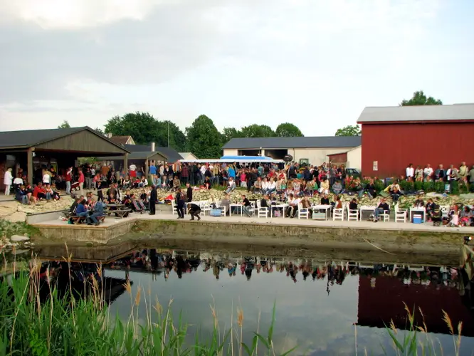 Stället heter Gangvide Farm. Publiken satt fint ovanför den lilla småbåtshamnen vid Närkån. (Kanten av scenen skymtar till höger)