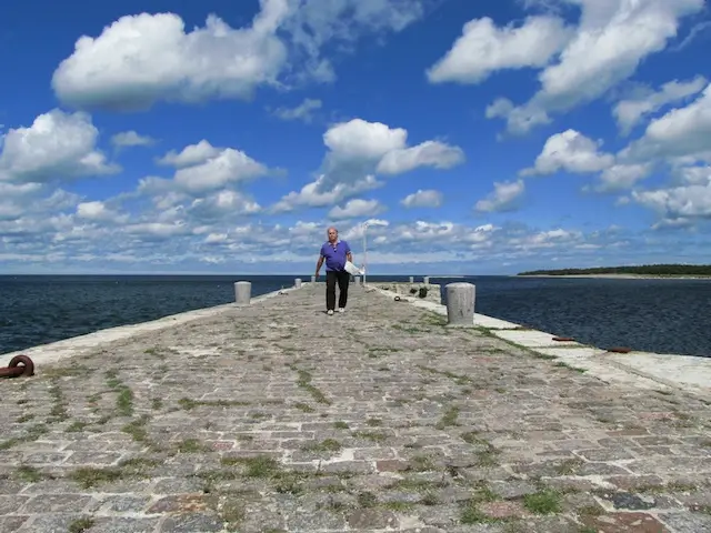 I torsdags gjorde vi en tur till Östra Gotland med Dorty och Eddy. Vi siktade in oss på att äta lunch vid rökeriet i Katthammarsvik – det röda huset som syns längst in. Jag åt suveränt god varmrökt lax med romsås. När vi gick ut på den här kajen blåste det märkligt nog mer den första halvan än när man verkligen gått hela vägen ut.