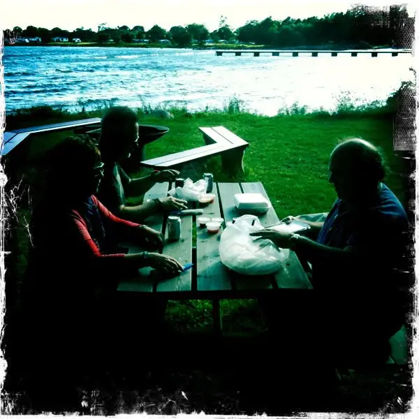 Vi åkte hemåt mot Kappelshamn och stannade till i Slite. Vi köpte Thaimat och tog med till ett bord i Badhusparken. Gissa om det blåste! Det krävdes mycket kreativitet för att få alla små burkar, servetter och bestick att hålla sig kvar vid bordet. Men härligt var det!