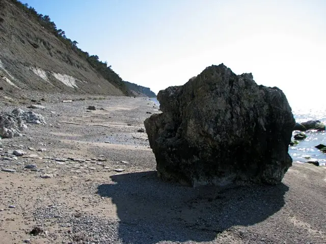 En bit norrut blir det sandigare på stranden och nästan ensam ligger det här stora blocket.