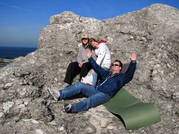 Här är Morgan, Alice och Roine på vår picnicplats bland raukarna vid Digerhuvud.