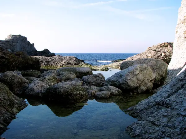 Jag klättrade runt lite och fotograferade. Här och där glimrar vattensamlingar. Utanför, i havet, är favoritplats för många dykare.