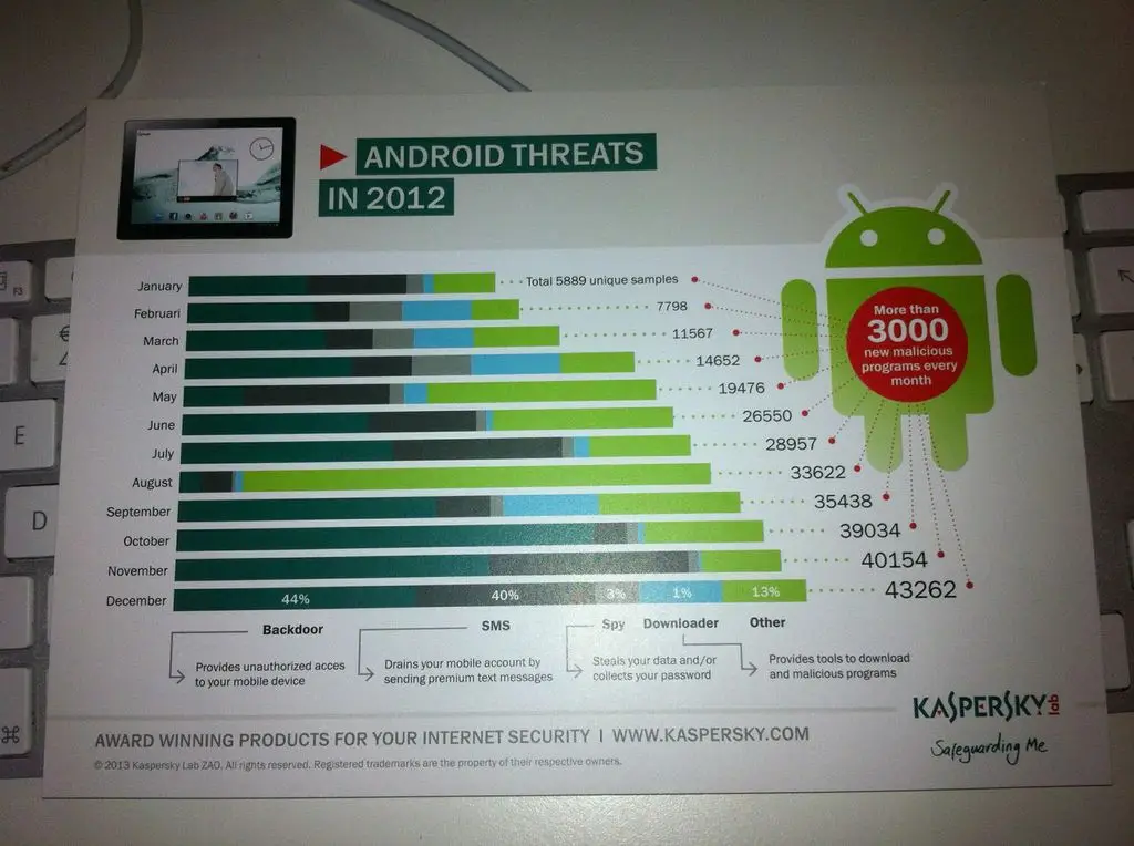 Androidfolket gillar inte sådan kontroll, de hyllar friheten. Det är ett helt annat sätt att tänka och ett av resultaten är att de också släpper in mycket mer skadlig programvara. Virusexperterna på Kaspersky räknar med att det släpps 3000 Androidappar med skadlig kod VARJE MÅNAD. Sug på den! Kod som smyger sig in bakvägen i din smartphone och kollar runt, kod som skickar text från din smartphone via sms, kod som spionerar och stjäl dina lösenord och kod som laddar ner ännu mer skadlig programvara till din smartphone.